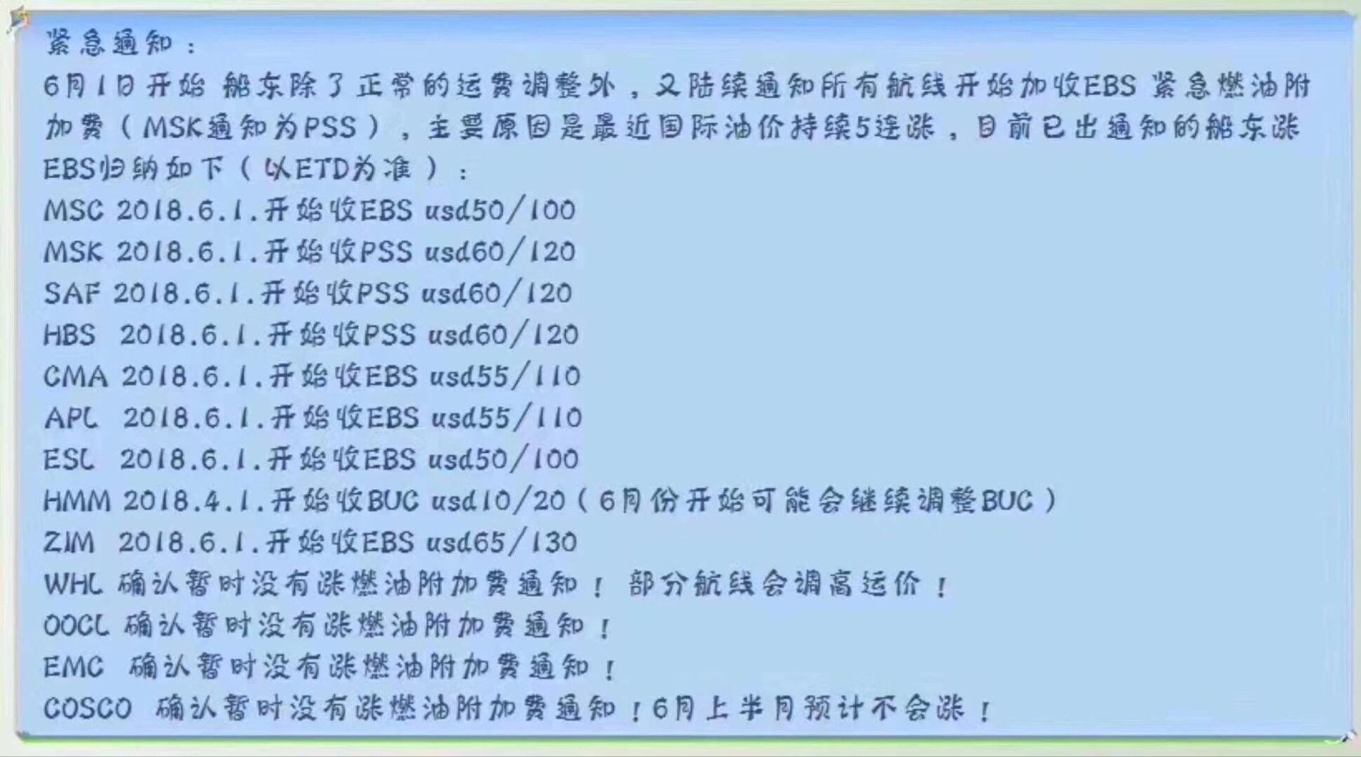 我們剛剛得到確切的消息,由于國際油價(jià)連續(xù)增長,各大船公司通知從6月1日起(開船日),加收緊急燃油附加費(fèi)。